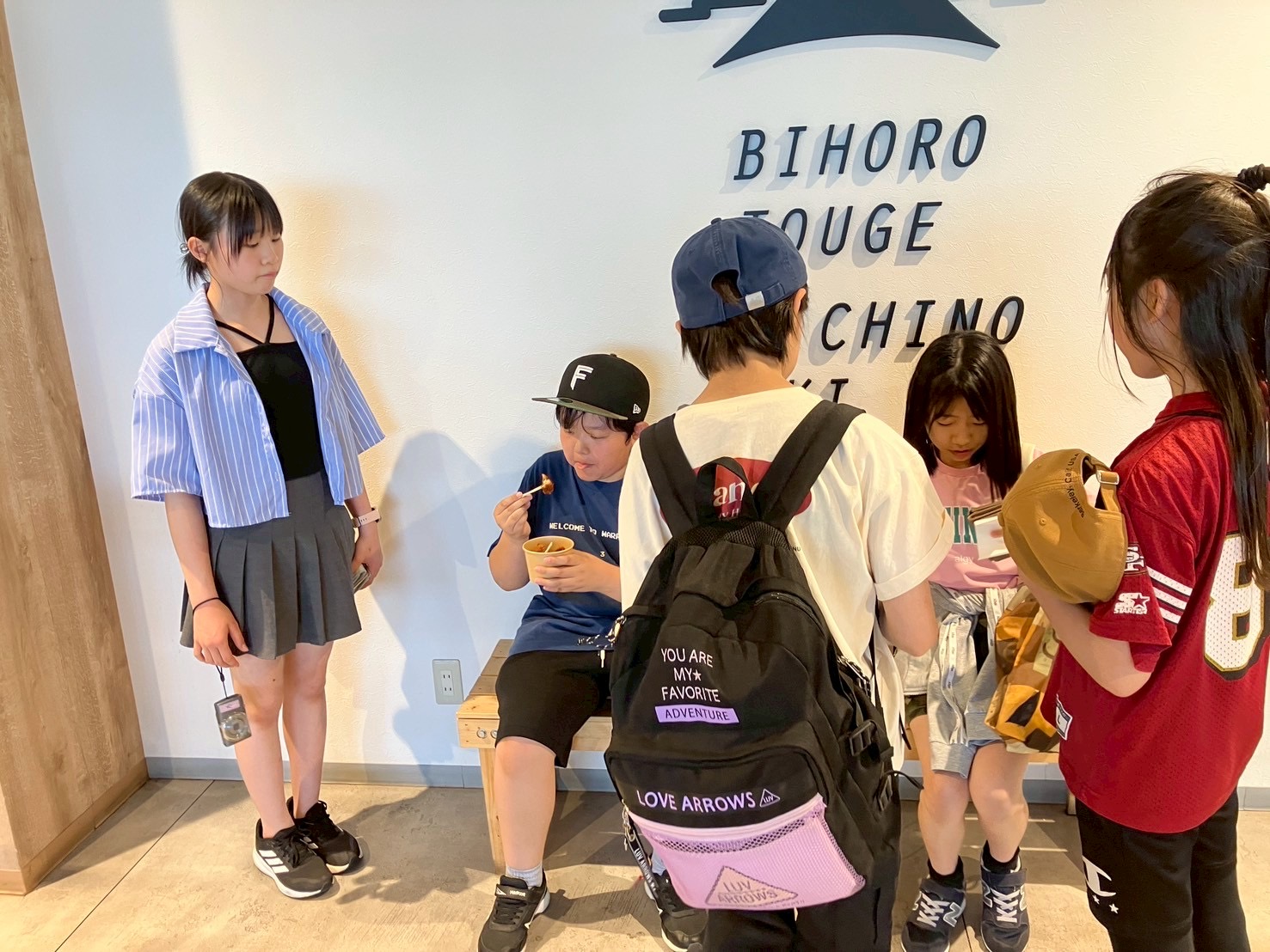 峠からの景色を眺めたり、名物揚げイモやソフトクリームを頬張る子もいました。